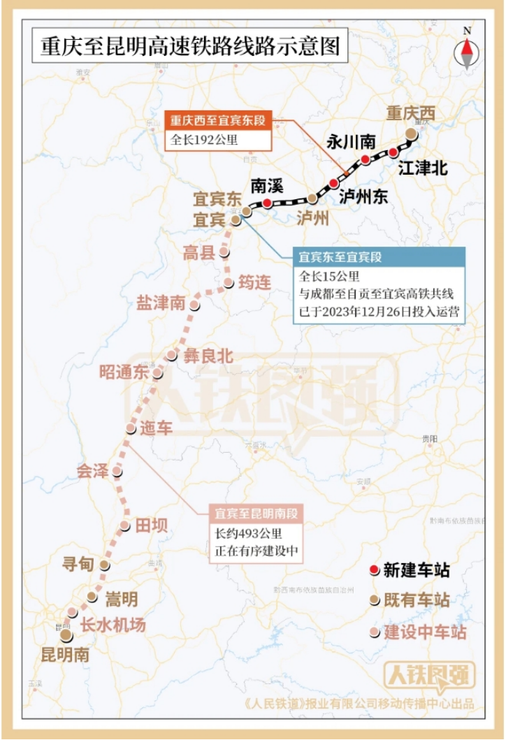 渝昆高铁线路自重庆枢纽重庆西站引出后,途经重庆市江津和永川区、四川省泸州和宜宾市、贵州省毕节市、云南省昭通和曲靖市,接入昆明枢纽昆明南站,全长约700公里,设计时速350公里。全线分段建设,此次开通的重庆西至宜宾东段全长192公里,设重庆西、江津北、永川南、泸州东、泸州、南溪、宜宾东等7个车站,其中江津北、永川南、泸州东、南溪为新建车站,其余为既有车站;宜宾东至宜宾段全长15公里,与成都至自贡至宜宾高铁共线,已于2023年12月26日投入运营;宜宾至昆明南段长约493公里,正在有序建设中。