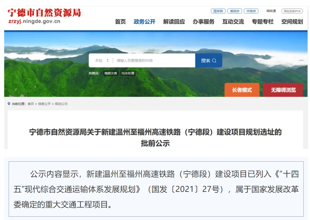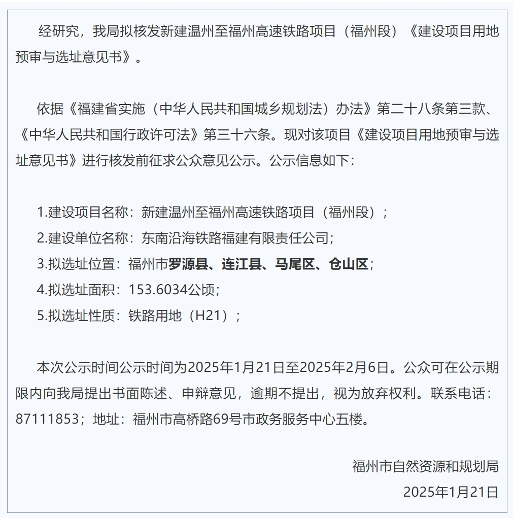 1月21日,福州市自然资源和规划局发布《新建温州至福州高速铁路项目(福州段)批前公示》。公示内容如下↓